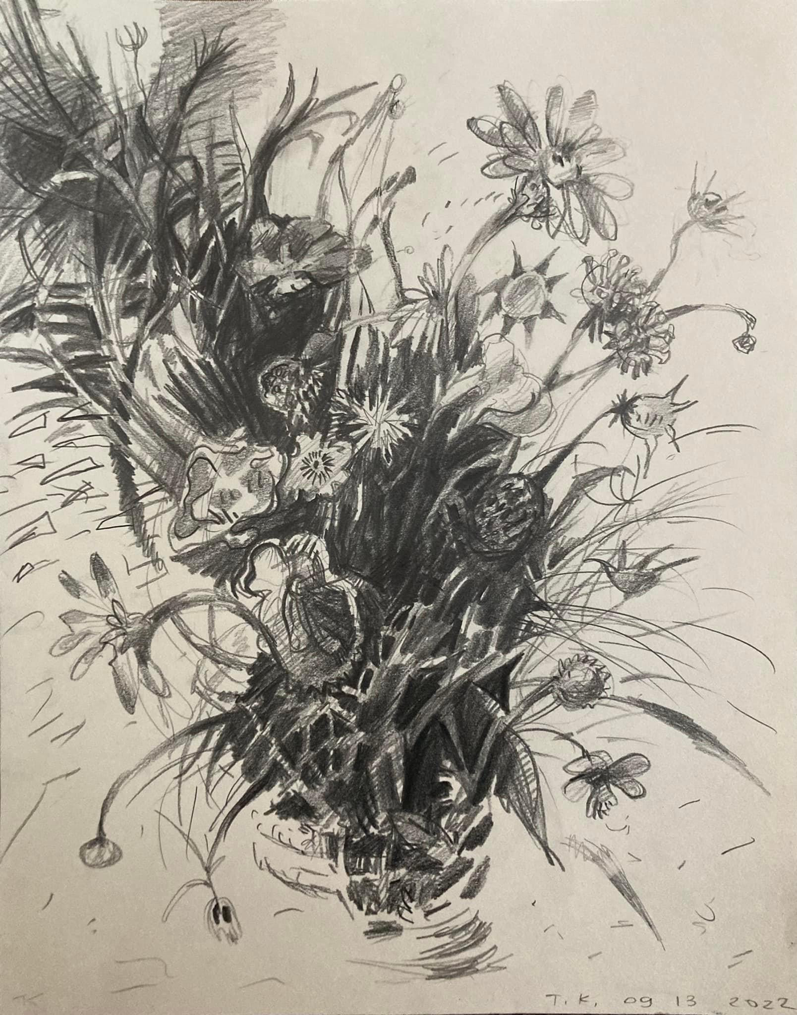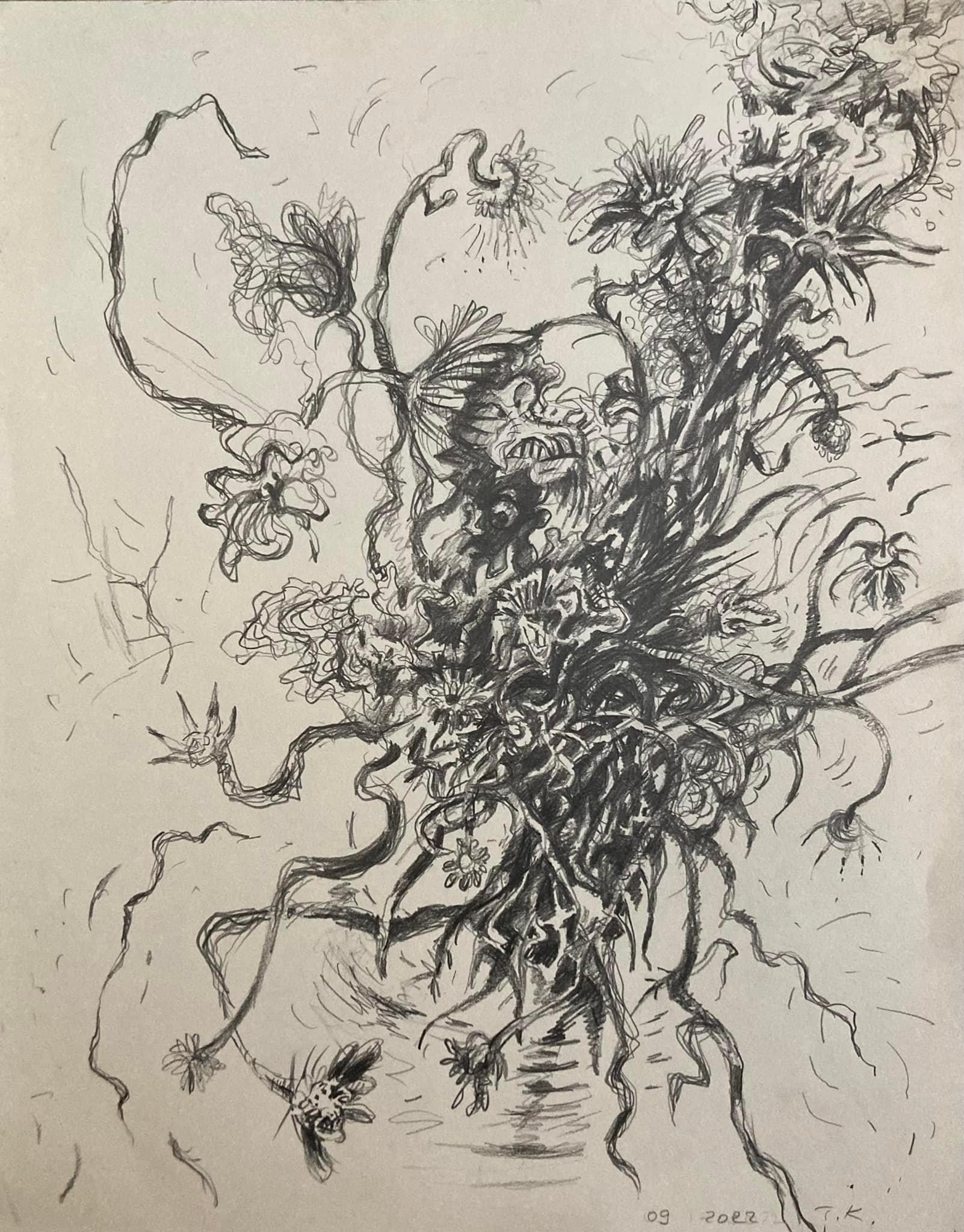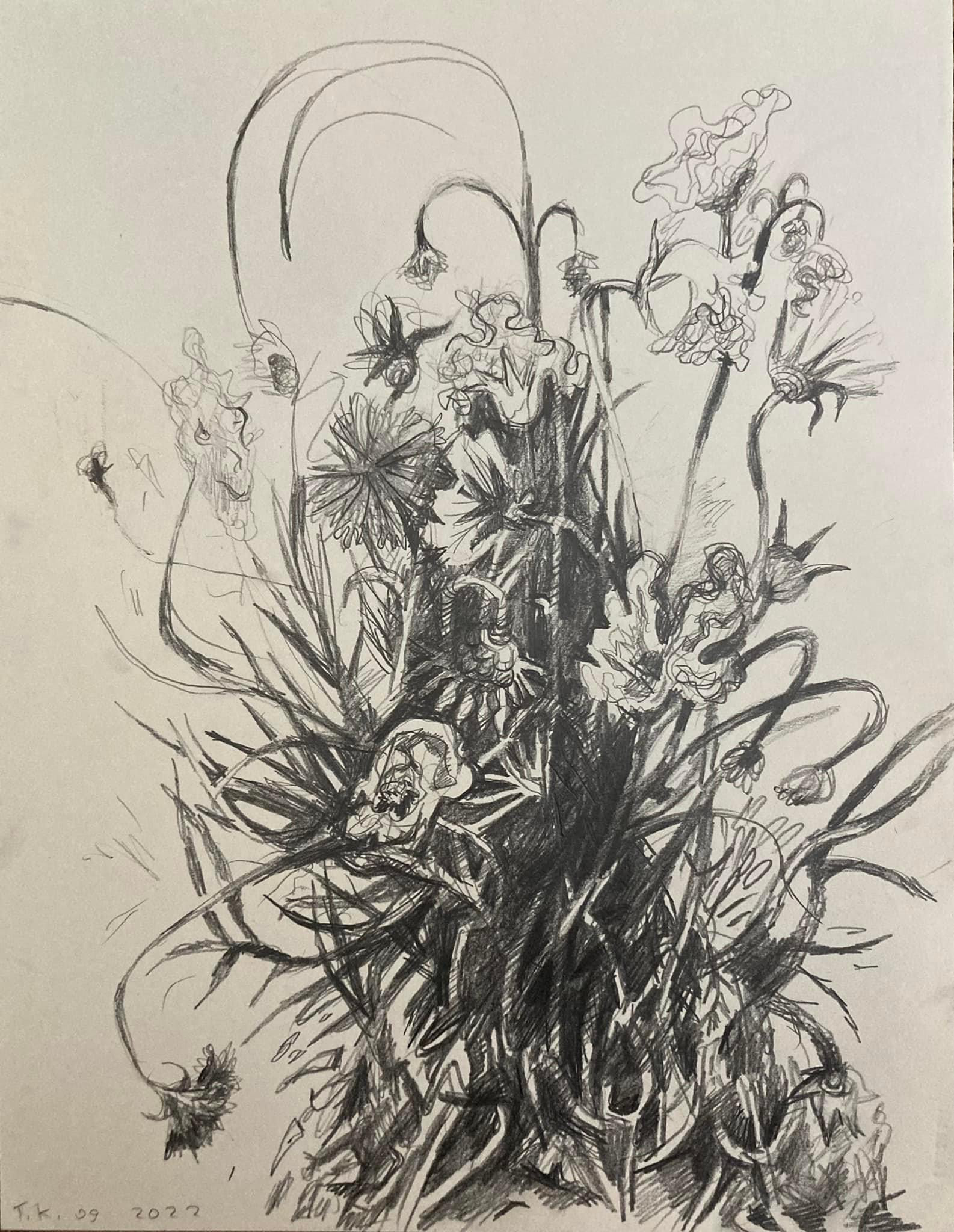 I am interested in the process of aging and fading. As people get older, they acquire scars and wrinkles which speak about a person's character, experiences, and life events. Wrinkles are a kind of diary – plants have them too. This bouquet that I picked on a wildflower farm in upstate New York was beautiful, but as it wilted, it became even more interesting. The color and shape of the flowers became more complex, irregular, more intricate and mature, showing a struggle for life and a longing for light. As the flowers wilted, faces with different expressions began to appear in these forms, and the bouquet itself began to turn into a living being.